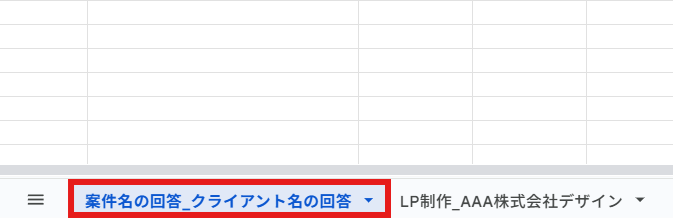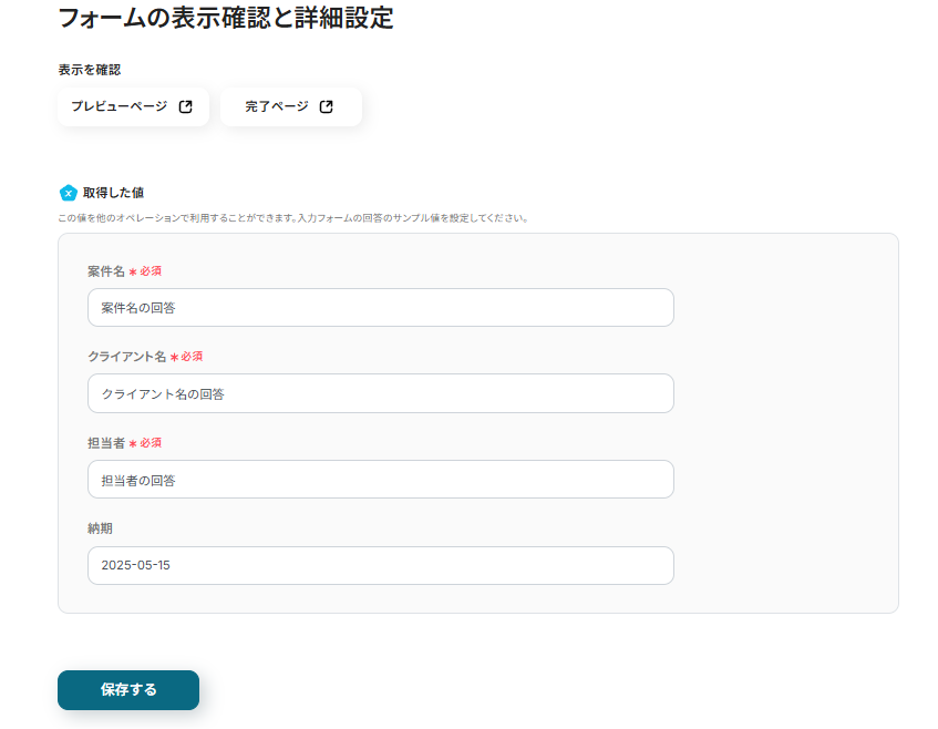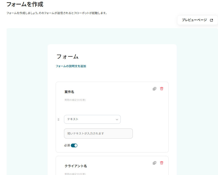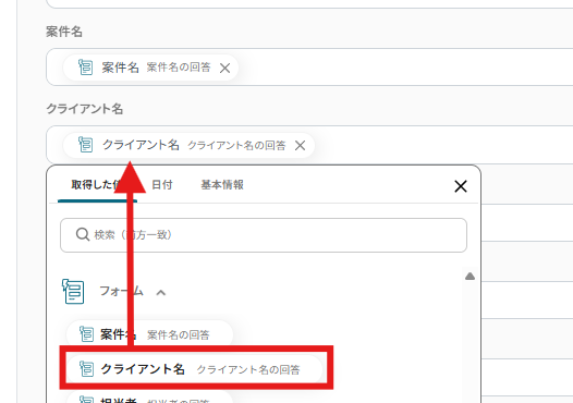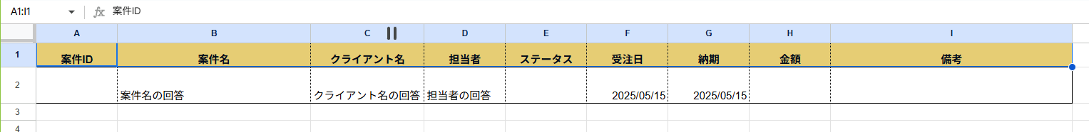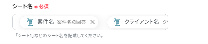 なお、今回は「案件名」と「クライアント名」がすでに設定されていますが、ここで設定済みのフォームがコピーしたスプレッドシート名になるため、そのように設定を行ってください。