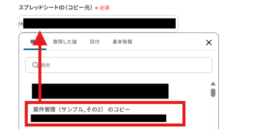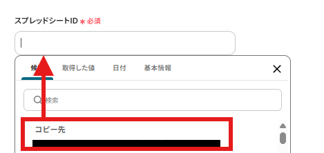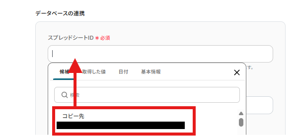スプレッドシートIDは、コピー先のGoogle スプレッドシートを以下のように表示される候補から選択しましょう。