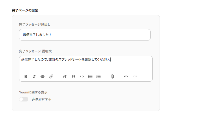 完了ページの箇所には、送信後の画面に表示される文言が設定できます。