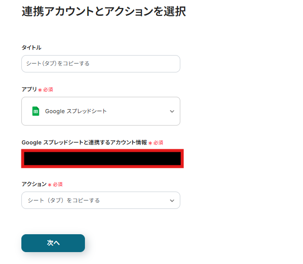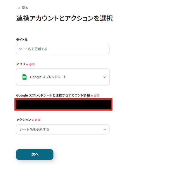 連携アカウントとアクションを選択する画面が表示されるので、今回連携するGoogle スプレッドシートのアカウントを確認し「次へ」をクリックします。