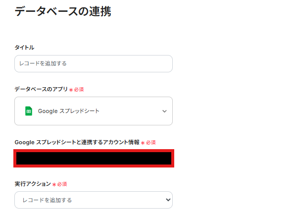 データベースの連携の箇所には、コピーしたGoogle スプレッドシートの内容を入力しましょう。