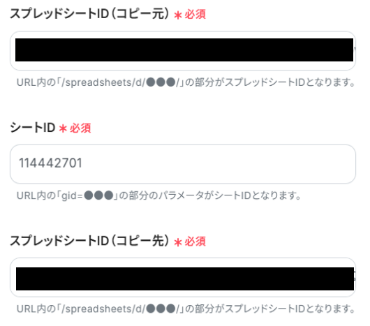 3.ここでは、コピー元とコピー先のGoogle スプレッドシートを設定します。