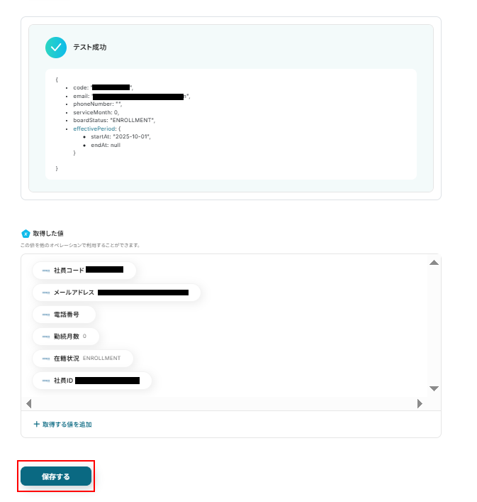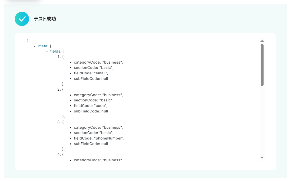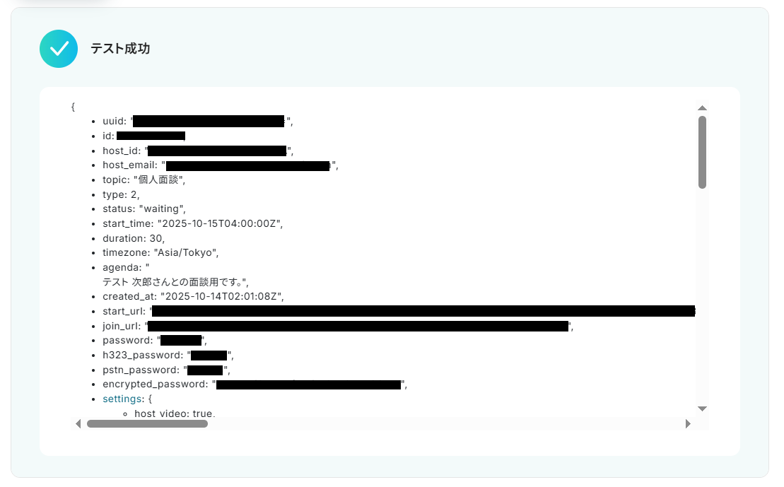 テストに成功するとテスト成功画面が表示され、取得した値が表示されます。