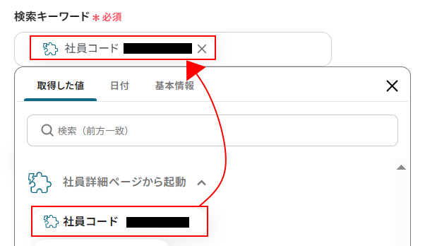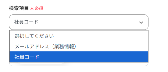 デフォルトで「社員コード」が設定されているため今回はそのまま使用しますが、以下のようにプルダウンメニューから選択することも可能です。