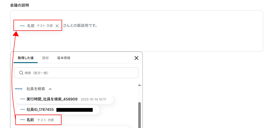 これにより、ミーティング情報と社員情報をスムーズに紐付けて管理でき、人事関連業務の円滑な進行をサポートします。