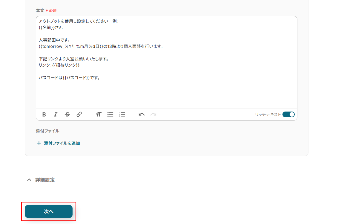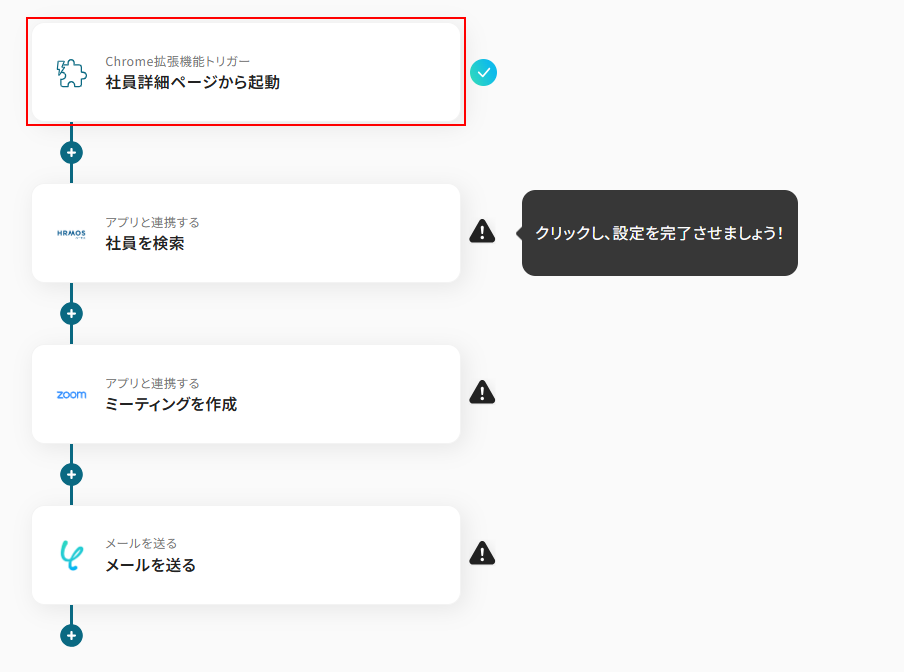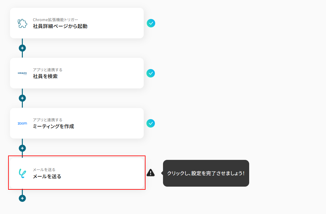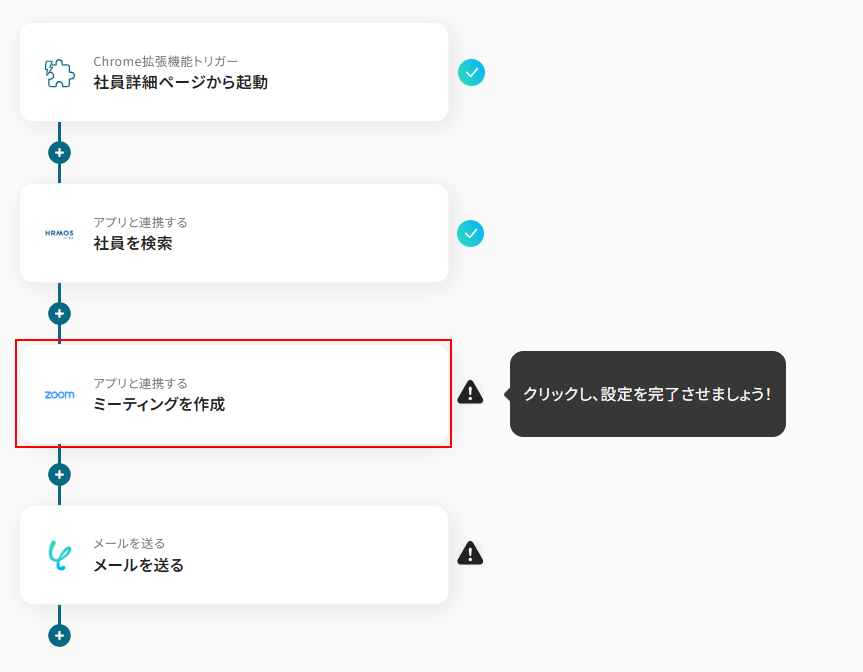 このワークフローを活用すれば、HRMOSの社員詳細ページからワンクリックでZoomミーティングの作成とメール通知までを自動化できます。