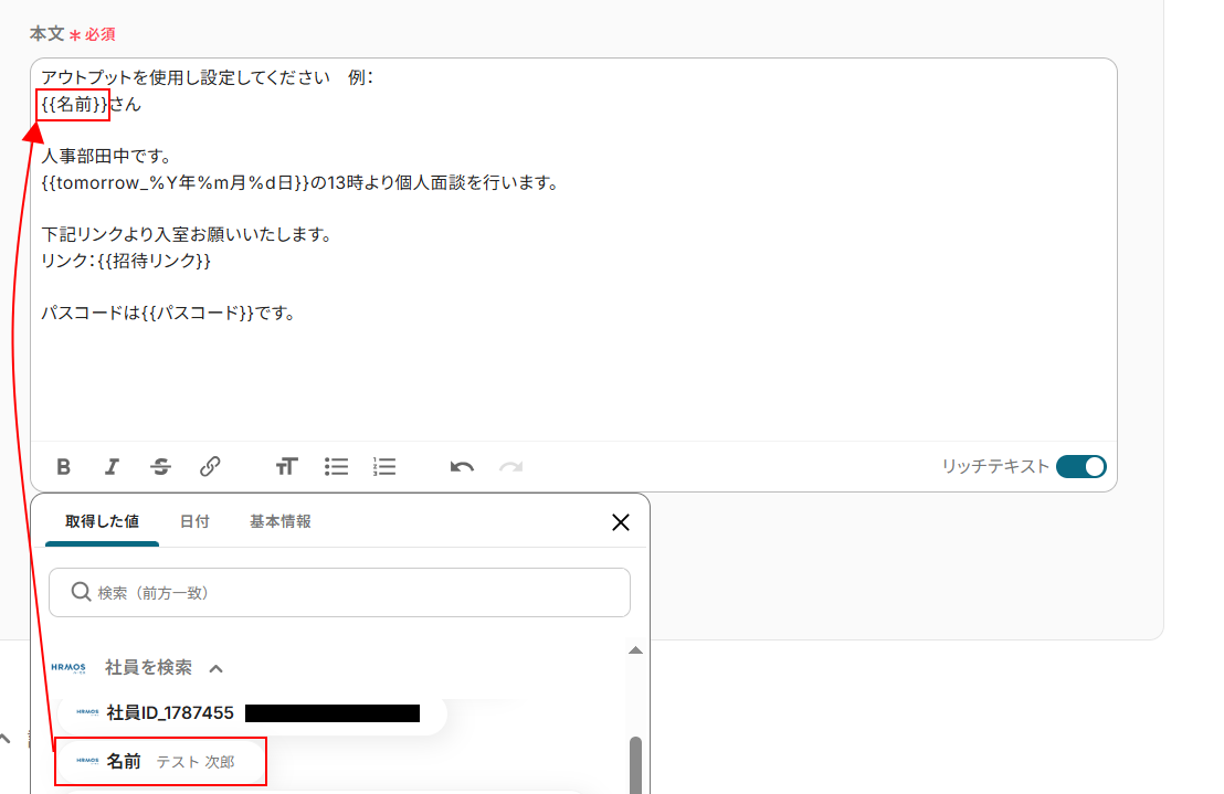 この連携を利用すれば、HRMOSの社員情報ページから必要な情報を抽出し、自動でZoomミーティングを作成可能です。
