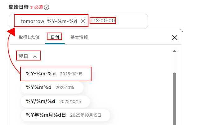 デフォルトで設定されているため今回はそのまま使用しますが、以下のように取得した値から選択することも可能です。