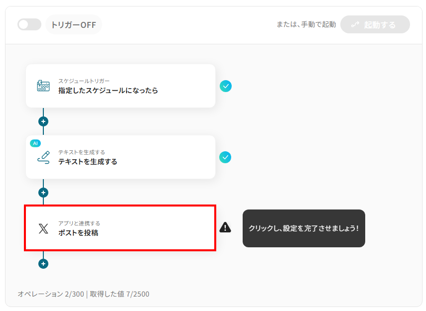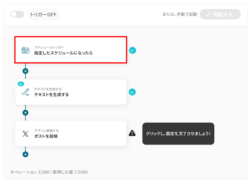 あらかじめ設定した定期的なスケジュール(例えば、毎日特定の時間や週に数回など)をトリガーとして、AIが自動でコンテンツを生成しX(Twitter)へ投稿するフローを構築できます。