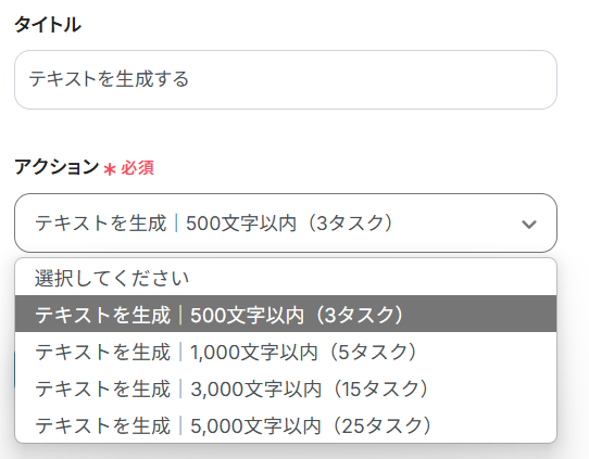 「アクション」は、デフォルトで「テキストを生成|500文字以内(3タスク)」が選択されています。