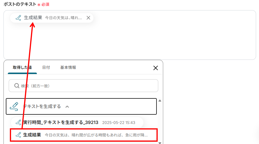 「ポストのテキスト」の入力欄をクリックすると下記のようなアウトプットが表示されるので、先ほど生成したテキストを選択しましょう。