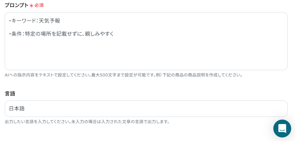- プロンプト:生成したいテキストの指示を入力しましょう。