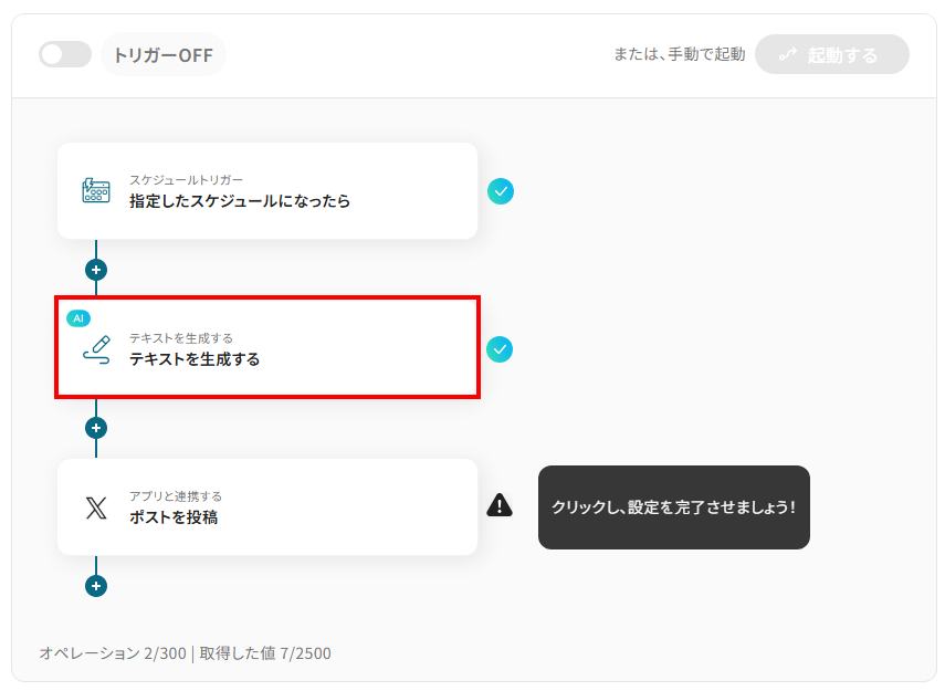 1.次に、X(Twitter)にポストするテキストをAIを使って生成する設定をしましょう。