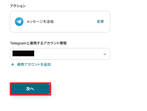 アクションは変更せず、アカウント情報がステップ3で連携をしたアカウントと一致することを確認したら、「次へ」をクリック。