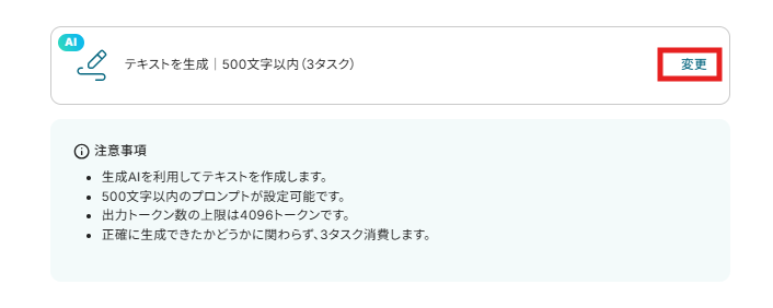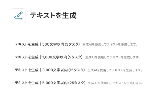 テキストを生成する変換タイプは「500文字以内(3タスク)」が設定されています。