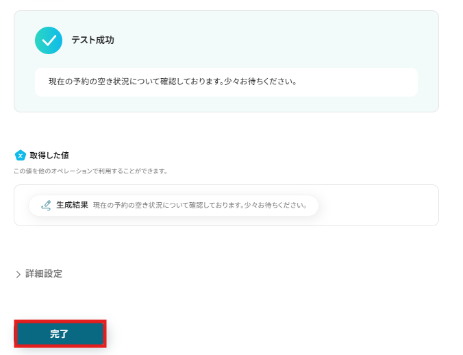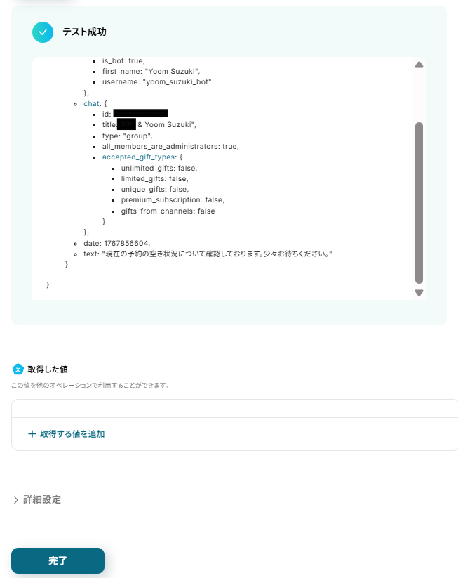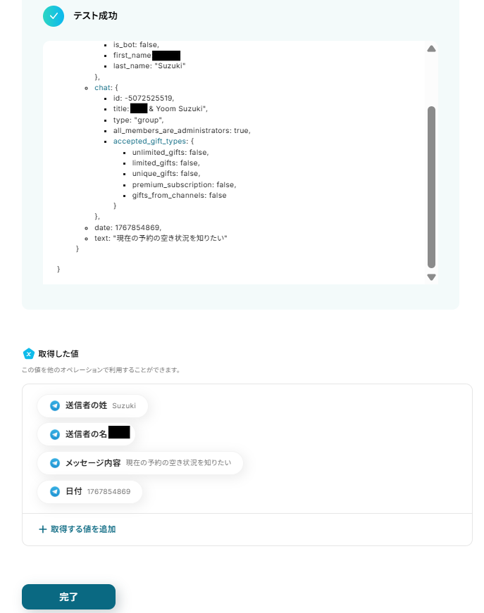 テストが成功し、取得した値にTelegramの情報が反映されているのを確認したら、「完了」をクリックします。