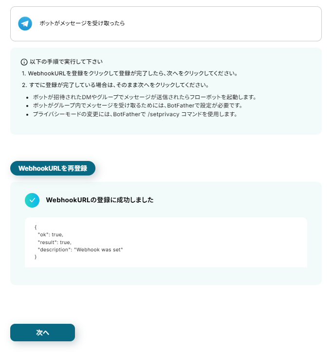 「WebhookURLを登録」をクリックし、成功したら次へをクリックしてください。