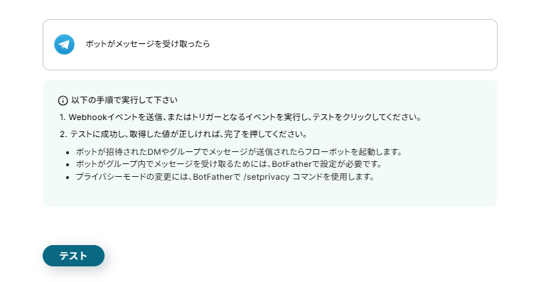 なお、Telegramのトリガーに使用しているボットではチャットIDが表示されないため、トリガーに使用しているボットとは別のボットのアクセストークンを使用してください。