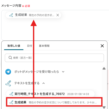 - Telegramの「メッセージを送信」アクションでは、返信する内容に固定のテキストを追加したり、フローの前のステップで取得した情報(受信したメッセージの内容など)を動的な値として埋め込むといったカスタマイズが可能です。