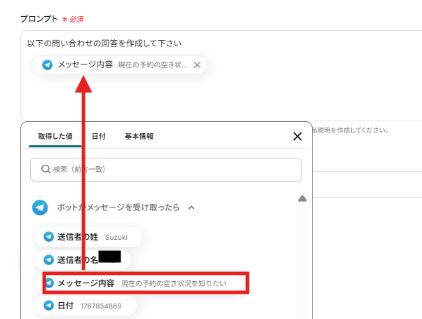 プロンプトは取得した値を活用して作成します。