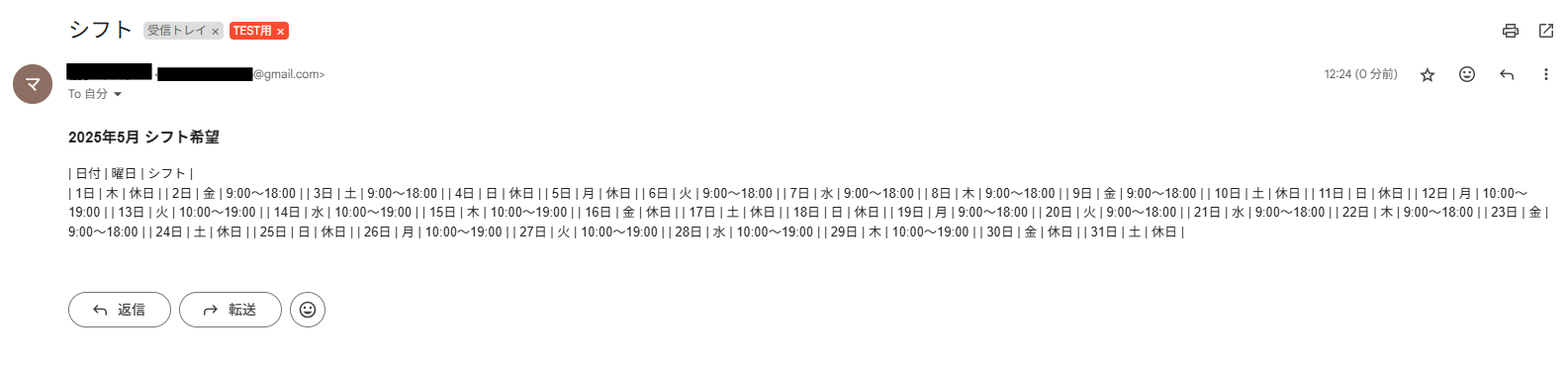 今回は下図のようなシフト希望メールを送信してみました。