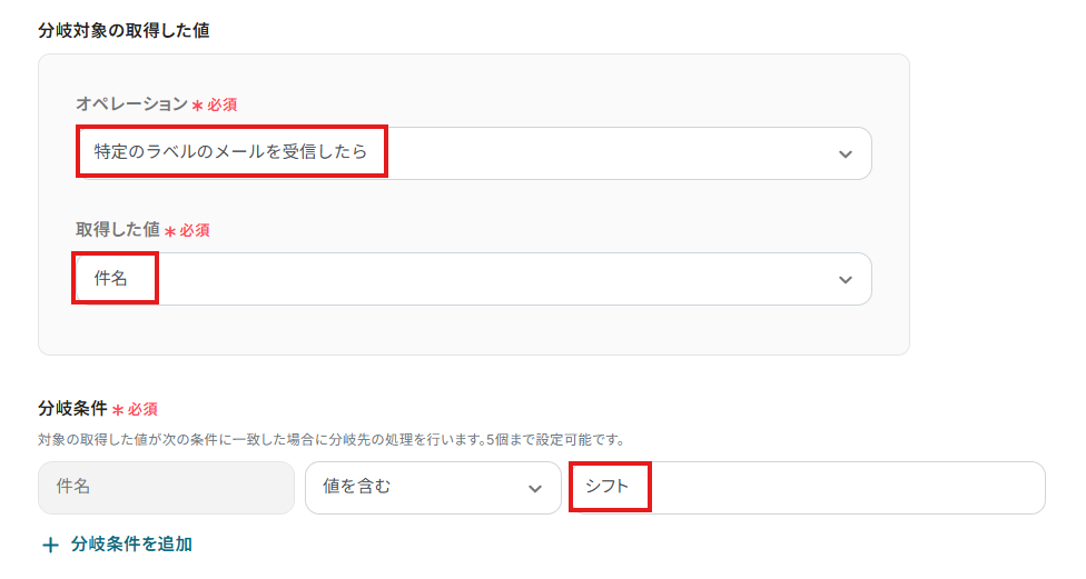 「分岐条件」は、分岐先の処理を行う条件を設定します。