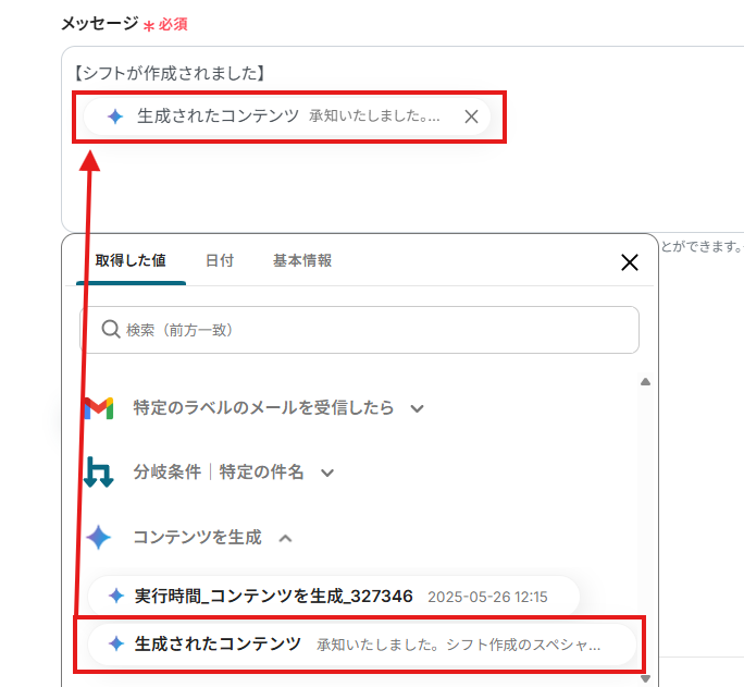 「メッセージ」は、入力欄をクリックして表示されるアウトプットから選択できます。