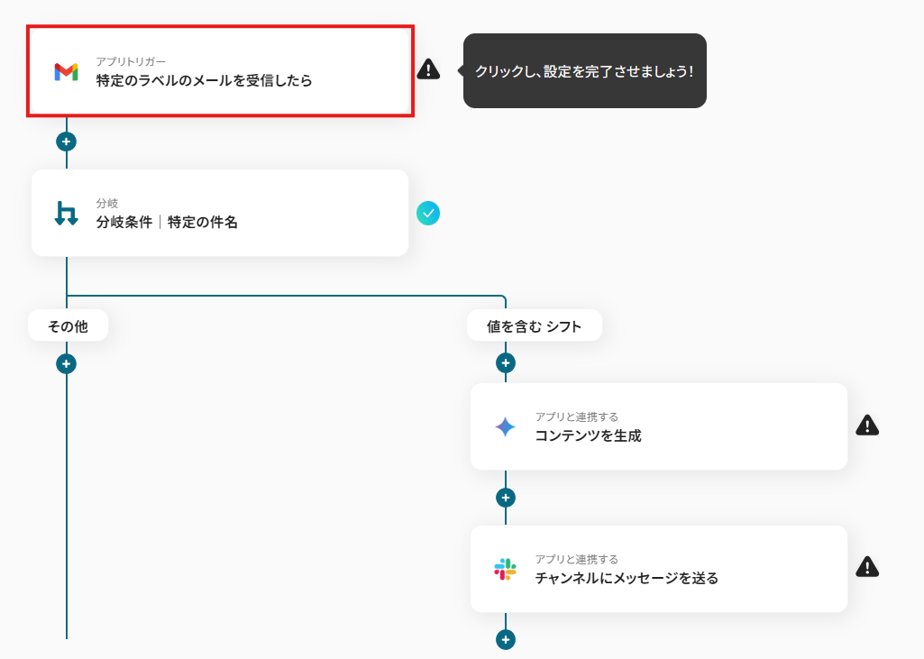 オペレーションに「特定のラベルのメールを受信したら」、取得した値に検知したい項目を設定します。