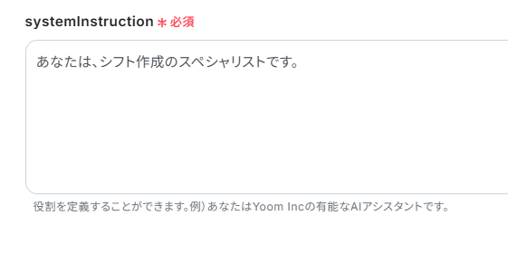 「systemInstruction」は、AIの役割を入力します。