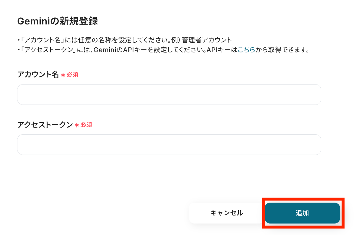 任意で管理用のアカウント名を記入し、アクセストークンを確認して、空欄に記入したら「追加」ボタンを押します。