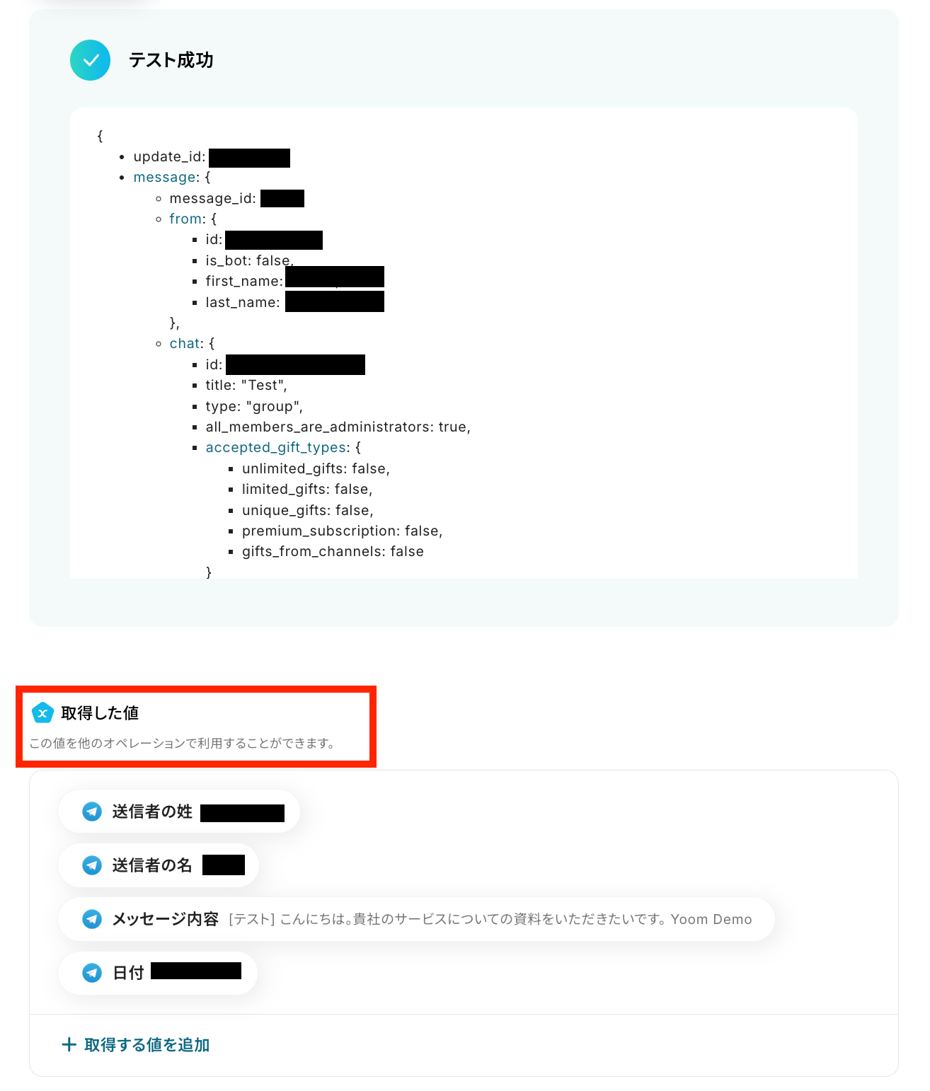 チャットIDをTelegramから確認して設定し、メッセージ内容を先ほど取得した値を活用して設定します。