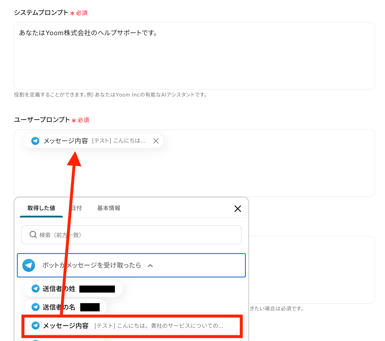 システムプロンプトでAIの役割を設定して、ユーザープロンプトでは、取得した値であるTelegramの「メッセージ内容」を設定します。