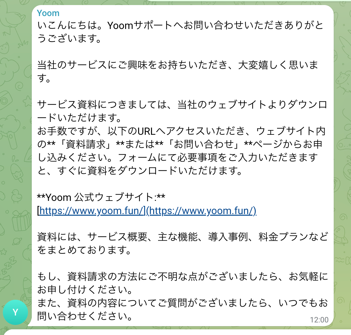 - Telegramでの問い合わせにAnthropic(Claude)が自動で返信するため、担当者が対応に費やしていた時間を短縮し、コア業務に集中できます