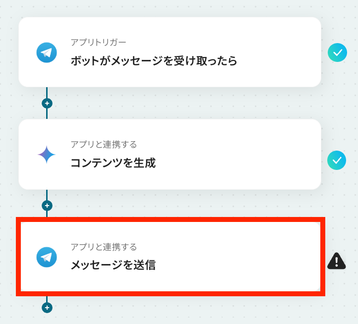 - 最後に、オペレーションで再びTelegramを選択し、「メッセージを送信」アクションで、Geminiが生成した内容を送信します。