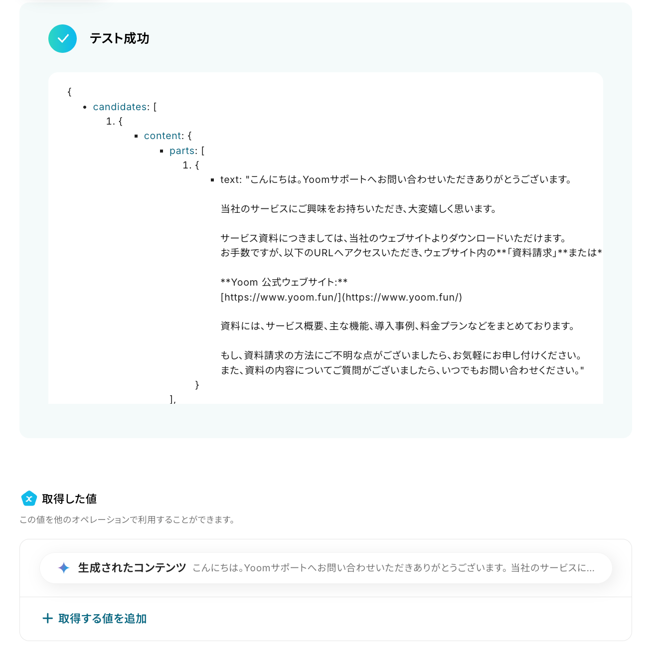 ※取得した値とは、トリガーやオペレーション設定時に「テスト」を実行して取得される値のことです。