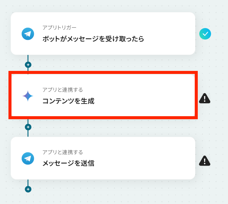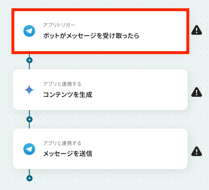 それではここから代表的な例として、Telegramボットがメッセージを受け取ったら、AIが返信文を自動で生成・送信するフローを解説していきます!