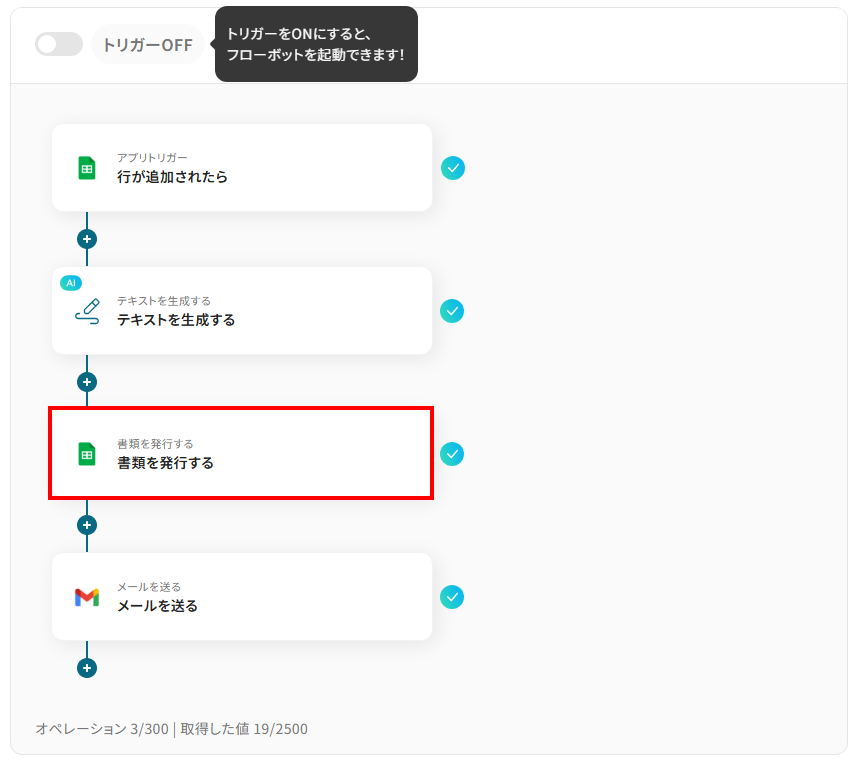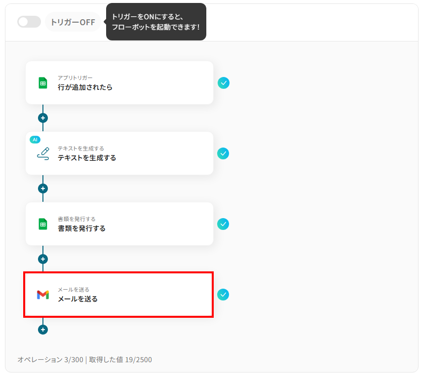 このワークフローを活用することで、行が追加された際にAIが自動的に請求書を生成し、Gmailを通じて自動送信されます。