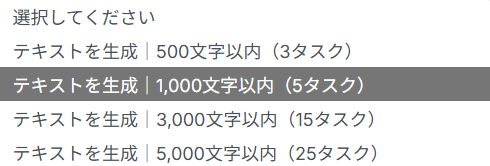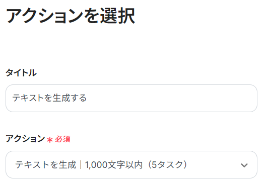 「アクション」は、デフォルトで「テキストを生成する|1,000文字以内(5タスク)」が選択されています。()内に表記されている消費タスク量に注意して選択しましょう。