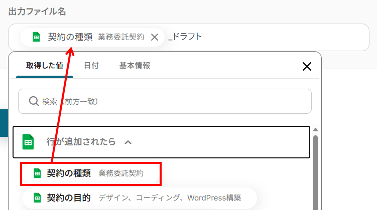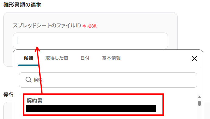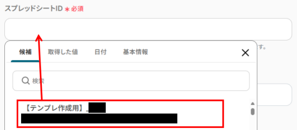 - スプレッドシートのファイルID:入力欄をクリックすると連携しているアカウントに紐づいて候補が表示されます。先ほど作成した、Google スプレッドシートの雛形を候補から選択しましょう。