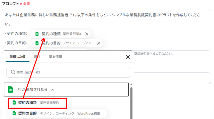 プロンプト欄をクリックすると、下記のようなアウトプットが表示されるので、Google スプレッドシートから抽出したアウトプットを選択し、お好きなように入力しましょう。