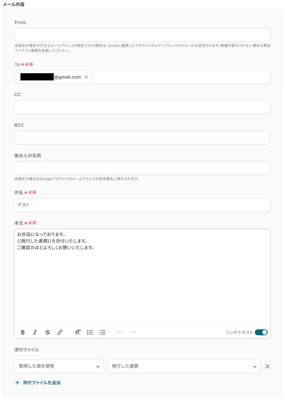 今回は、下記のようなメール内容にしました。画面下部にある「添付ファイル」の選択も忘れずに行います。