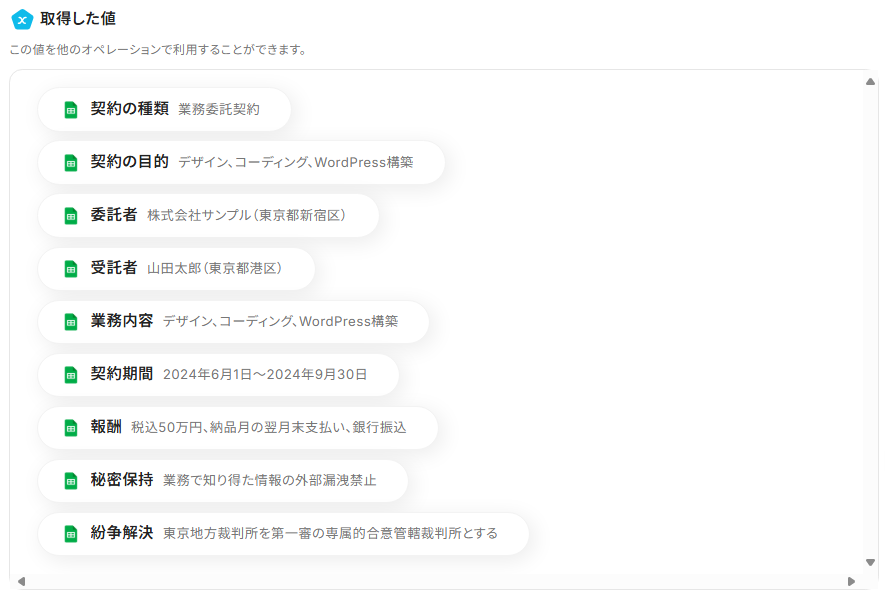 Google スプレッドシートなどのデータベースサービスに蓄積された情報をトリガーとして、AIが契約書を自動で作成し、指定された宛先にメールで送信することができるので、顧客情報や案件情報に基づいて迅速かつ正確な契約書作成と送付が実現し、手入力による手間やミスを削減できます!