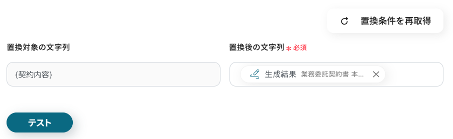 下図のようにそれぞれの入力欄をクリックするとアウトプットが表示されるので、「置換後の文字列」に適切な値を設定してください。
