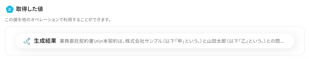 このワークフローでは、フォームに入力された情報をAIが読み取り、自動で契約書を作成。