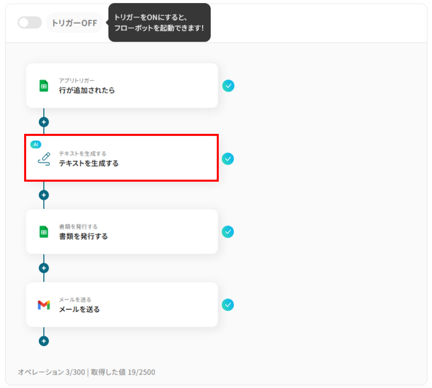 それではここから代表的な例として、Google スプレッドシートで行が追加された際に、その情報を基にAIが契約書を作成し、完成した契約書をGmailで自動送信するフローを解説していきます!