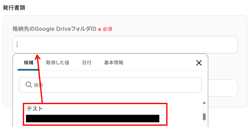 - 格納先のGoogle DriveフォルダID:こちらも入力欄をクリックすると候補が表示されますので、保存先となるGoogle Driveのフォルダを選択してください。