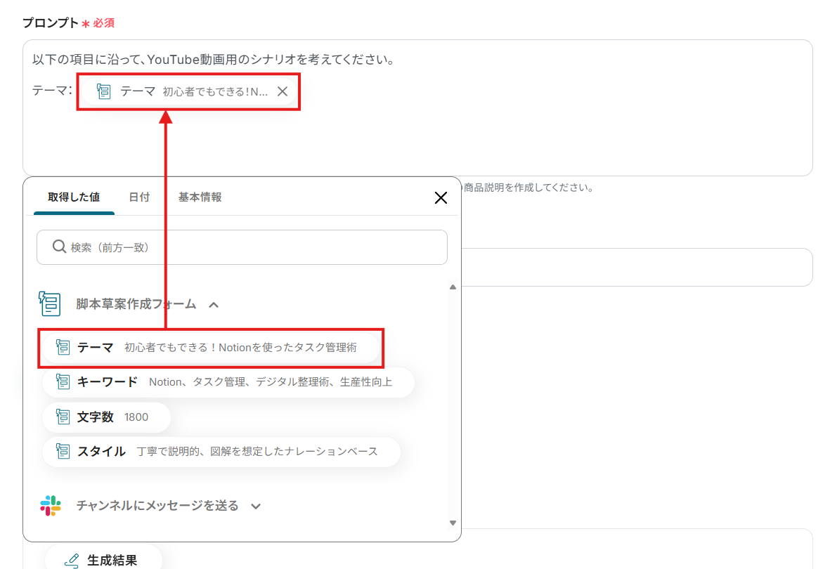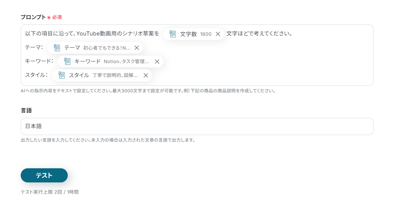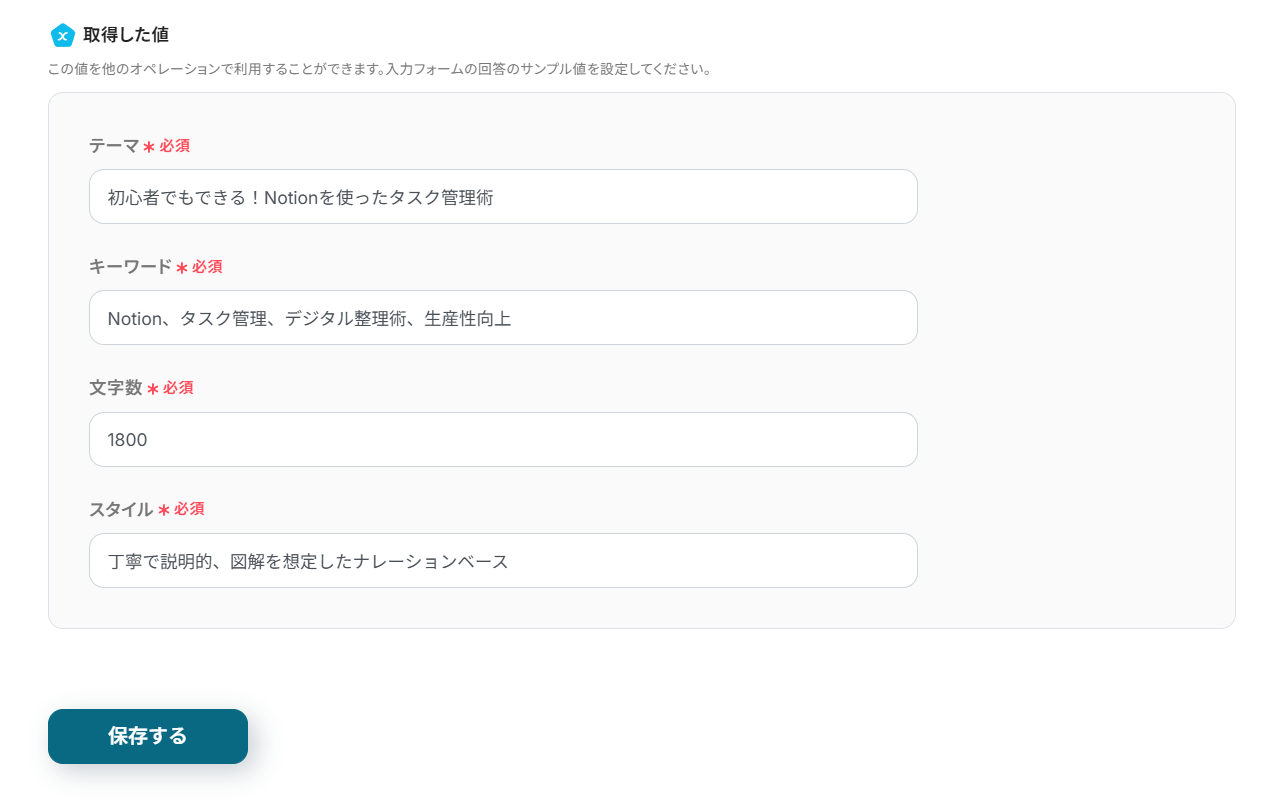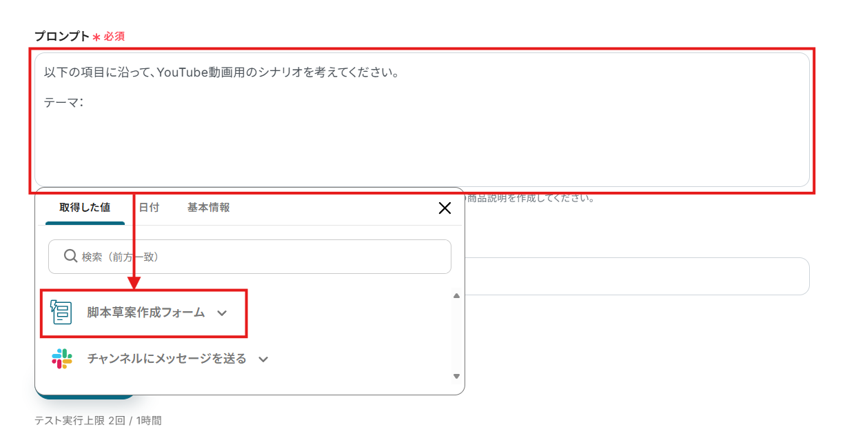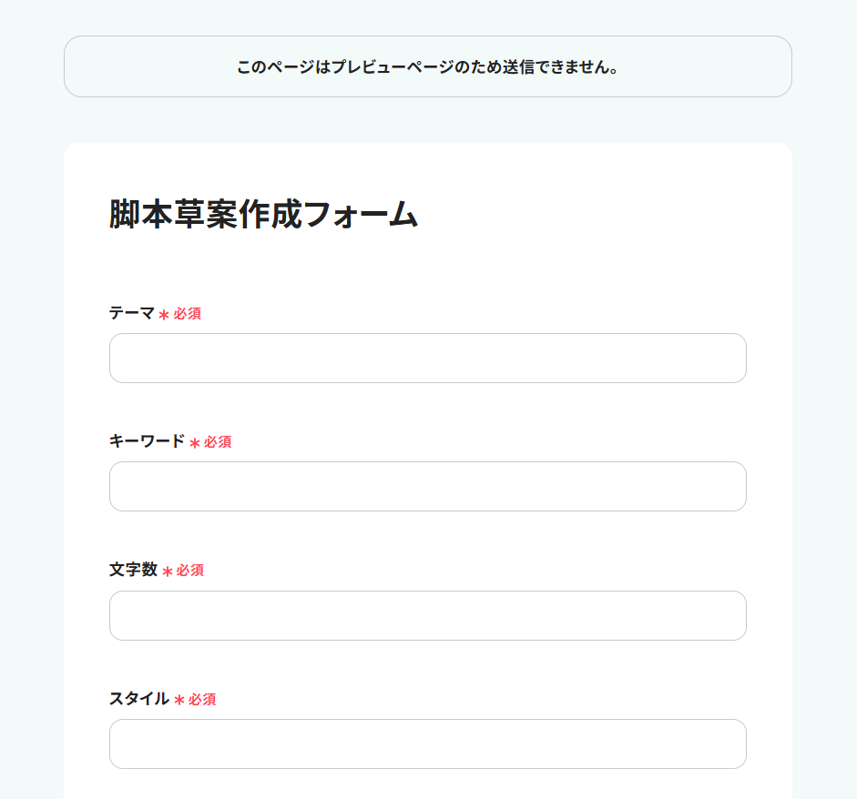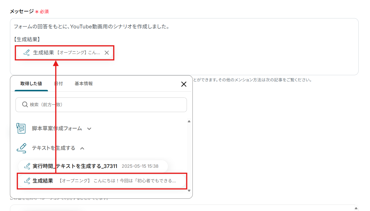 ※ ここではサンプル値を手入力していますが、フローボットが実際に起動した際には、フォームの回答を元にして脚本の草案が生成されます。