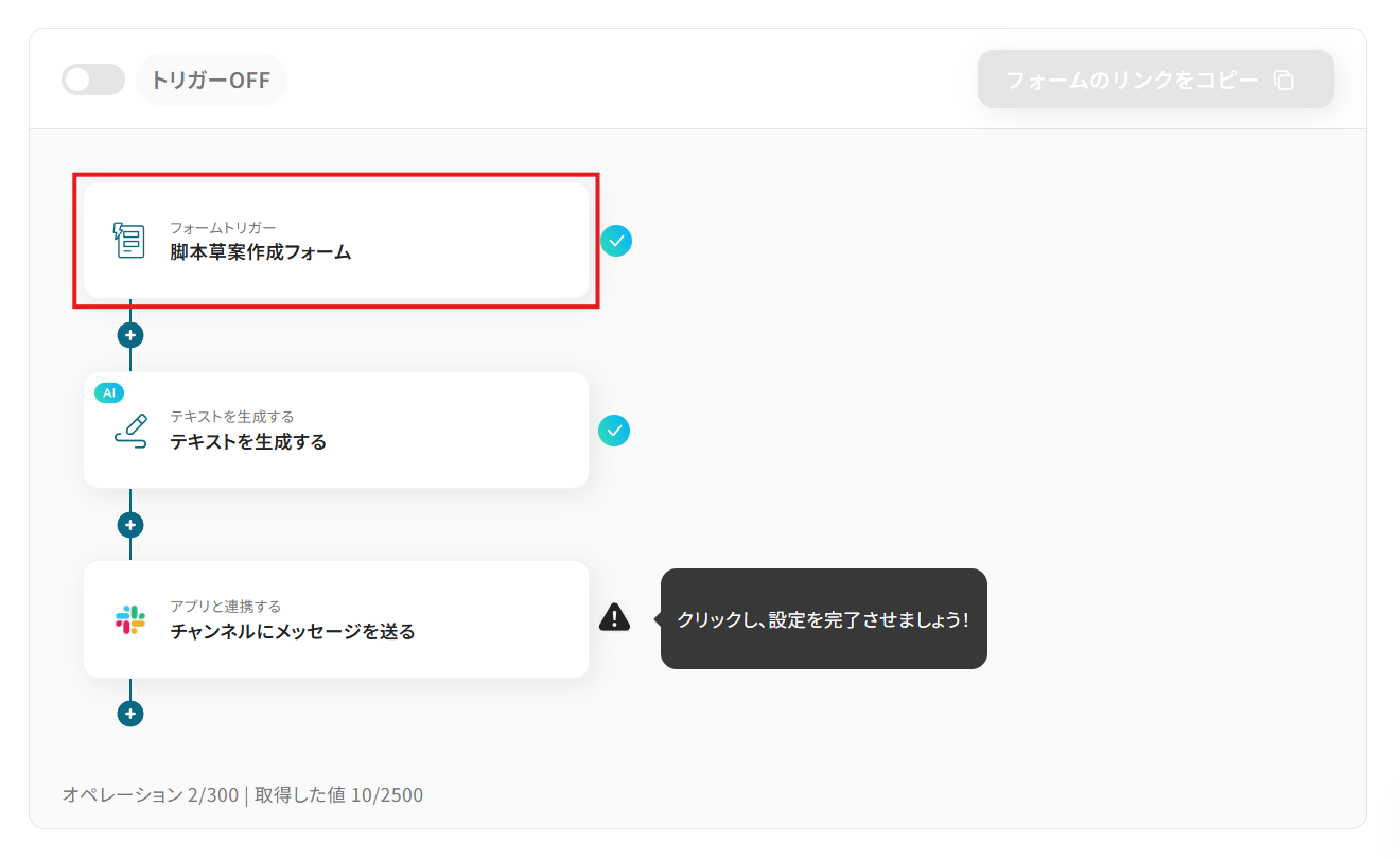 それでは代表的な例として、「Yoomの入力フォームに送信された内容をもとに、AI(例:ChatGPTやClaude)が脚本の草案を自動で作成し、その結果をSlackに通知する」フローを解説していきます!