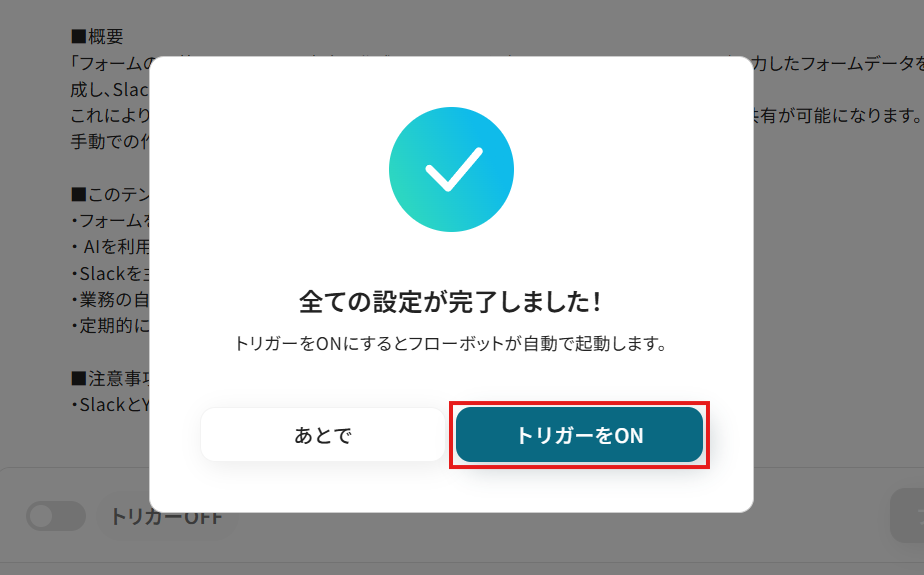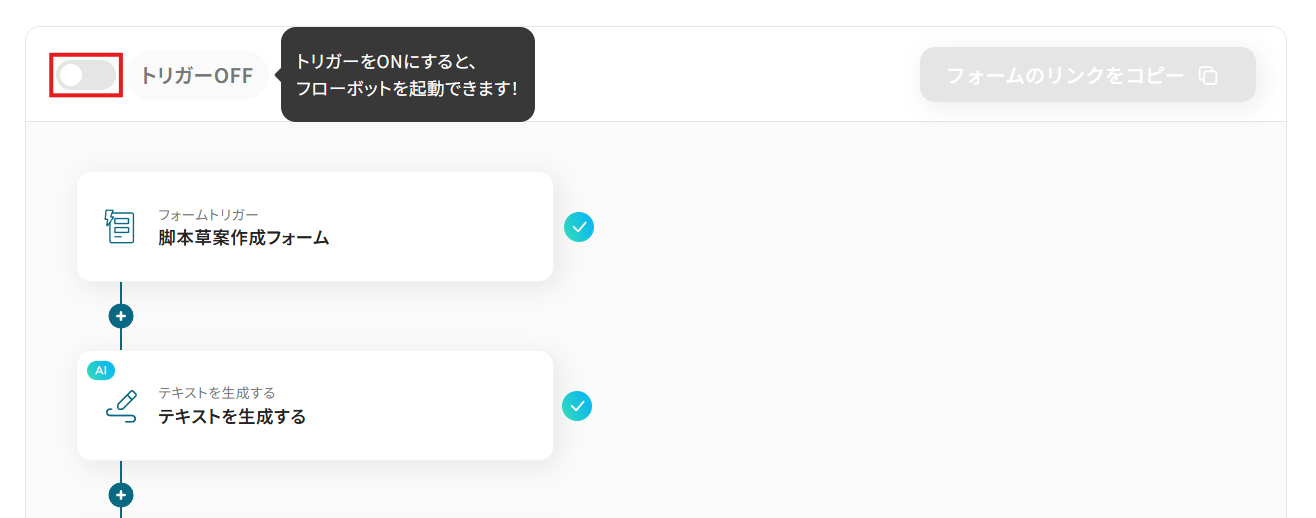 あとで稼働させる場合は、フロー画面のトリガースイッチをクリックすることで、トリガーをONにできます。