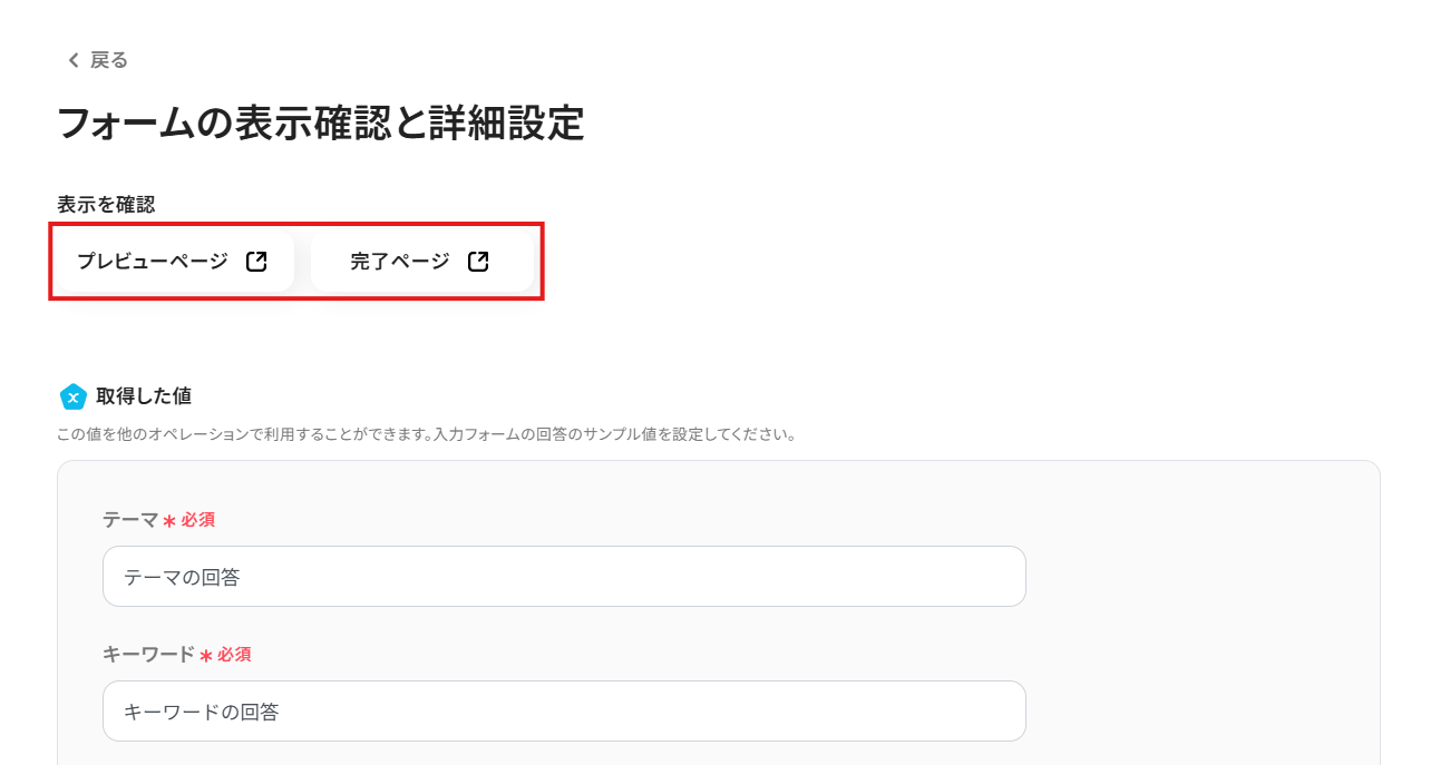 - 「プレビューページ」や「完了ページ」をクリックすると、作成したフォームや完了ページの表示を確認できます。